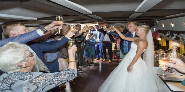 Na de officiële trouwceremonie gingen de trossen los en voer de huwelijksboot onder de stralende zon naar Gouda. Onderweg werd feest gevierd en de wimpel