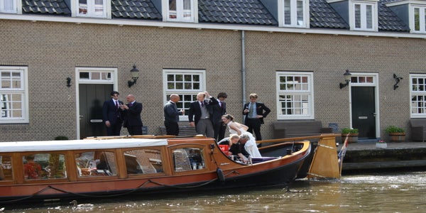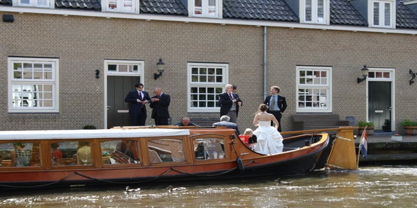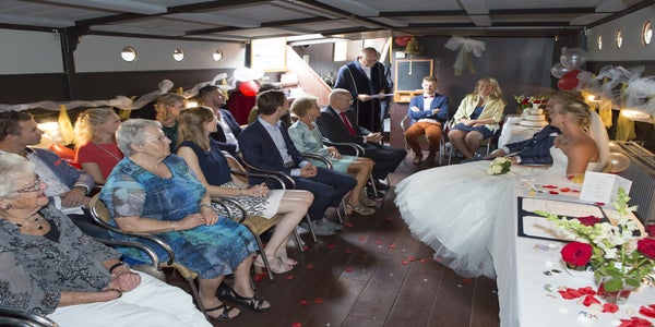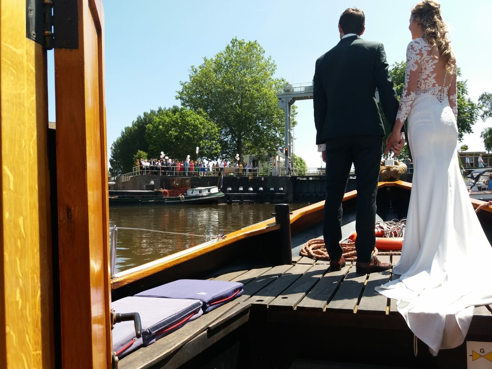 De meeste geliefden geven elkaar het ja-woord op het stadhuis. Maar ook andere plekken kunnen met toestemming van de gemeente tijdelijk als ‘huwelijkslocatie’ dienen. In Oudewater kunnen stellen op aanvraag nu ook letterlijk in het huwelijksbootje stappen. Teun en Esther Berkouwer hadden deze zomer de primeur! Geboren en getogen in een schippersfamilie lieten de geliefden zich in aanwezigheid van familie en vrienden in de echt verbinden op ijsselaak Den Onthaestingh.